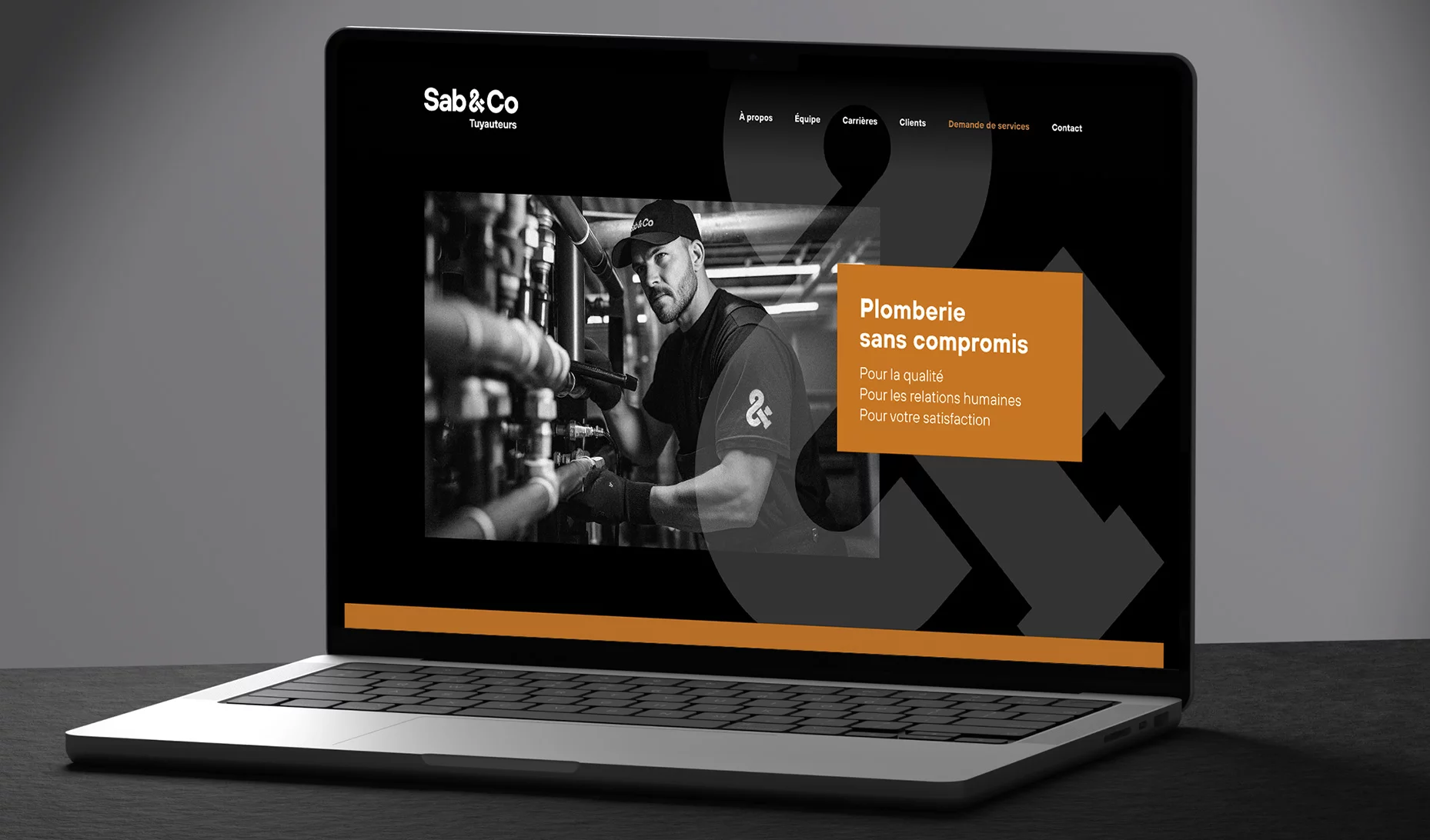 Le nom Sab&Co conserve un lien humain avec son fondateur tout en évoquant la notion d’équipe et de collaboration. La signature “Plomberie sans compromis” traduit l’exigence et la fierté du travail bien fait, tandis que le logo, inspiré d’un tuyau formant une esperluette, exprime la précision et la modernité du métier.